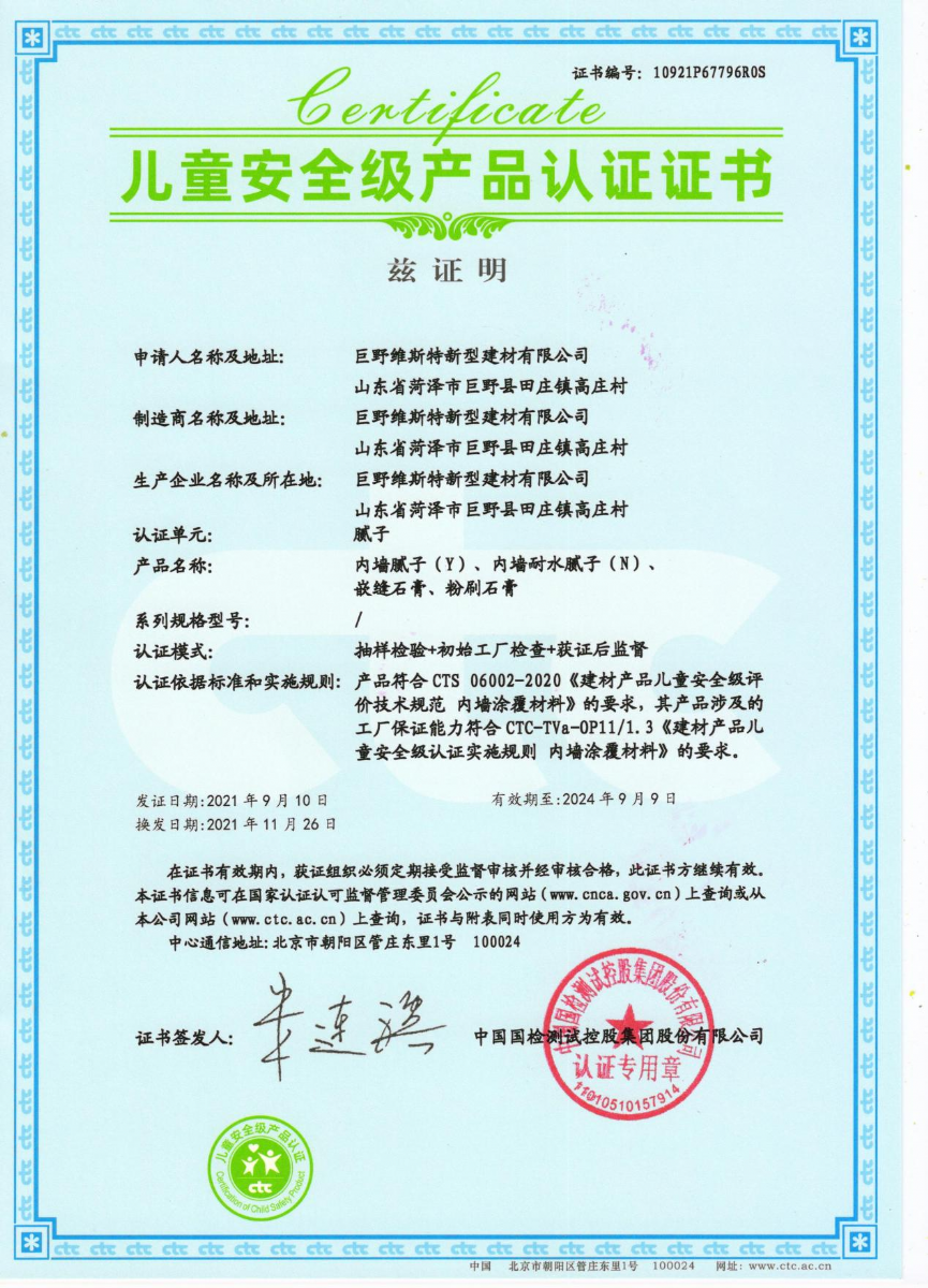 該系列通過中國建材中心頒發(fā)的“兒童安全級認證證書”。(該證書是行業(yè)內(nèi)第二個榮獲兒童安全認證產(chǎn)品),voc(揮發(fā)性有機化合物)、甲醛甲苯以及重金屬含量檢測標準要更加嚴格,產(chǎn)品符合《建材產(chǎn)品兒童安全級評價技術規(guī)范 內(nèi)墻涂覆材料》要求。